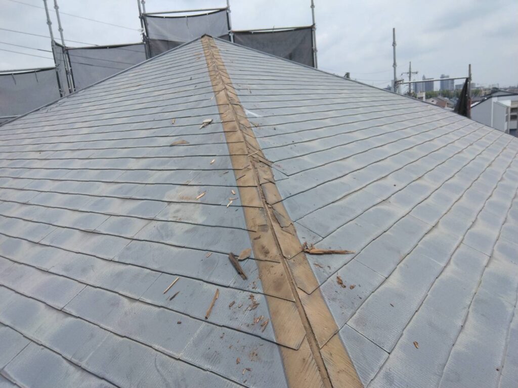屋根の“てっぺん”を守る棟(むね)部分には、再び板金を取り付けます。