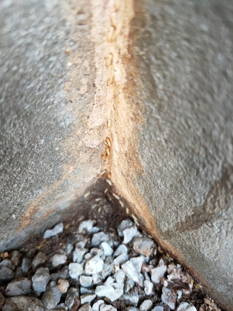 さらに床下に潜って点検すると、今まさに浸入する寸前という状態でした。白アリは気づかないうちに木材を食い荒らし、建物の強度を落としてしまう怖い存在です。早めに見つけられて本当に良かったです。