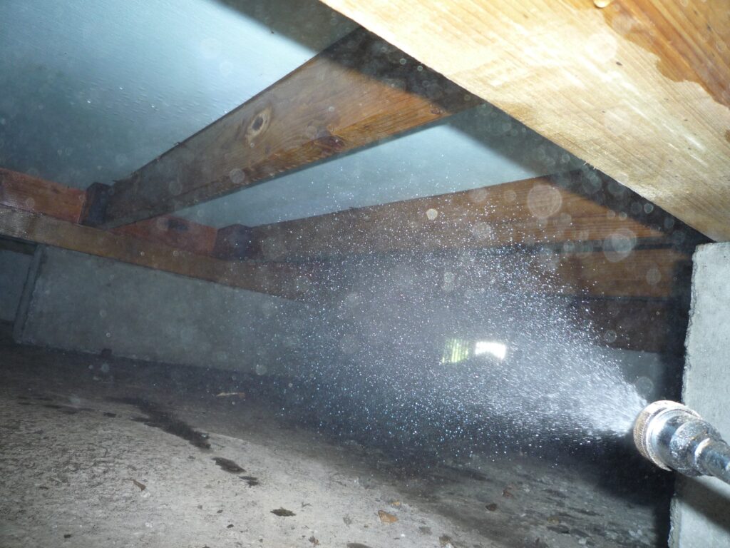 ご安心ください!弊社で使用している防蟻剤は、人やペットに無害なホウ酸塩を主成分としたものです。農薬系の強い薬品ではなく、自然由来の成分なので安全性が高く、小さなお子様やペットのいるご家庭でも安心して施工できます。 実際の作業では、台所の収納庫から床下に入り、薬剤を丁寧に散布。この作業を2回繰り返し、しっかりと施工を完了しました。