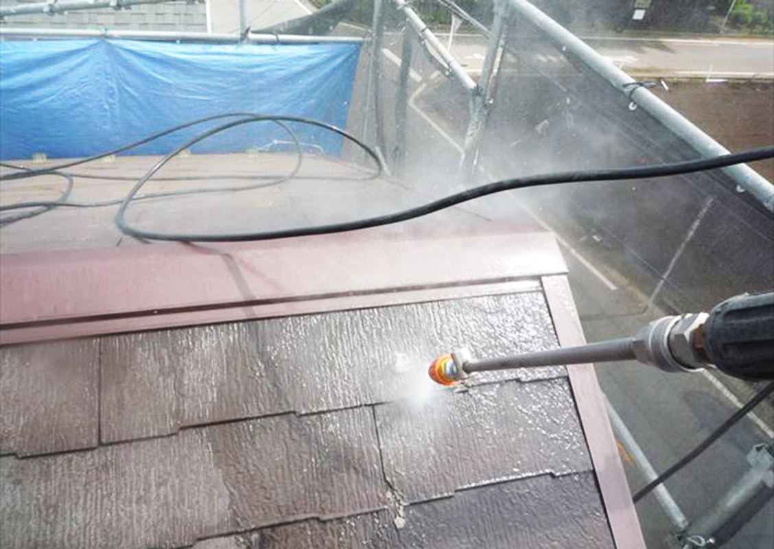 高圧洗浄機で汚れを一気に洗い流します。外壁や屋根に付着したコケやホコリ・旧塗膜などをきれいにするための作業です。驚くほど汚れが落ちていきます。洗浄をする事で素地と下塗り材が、しっかりと密着します。
